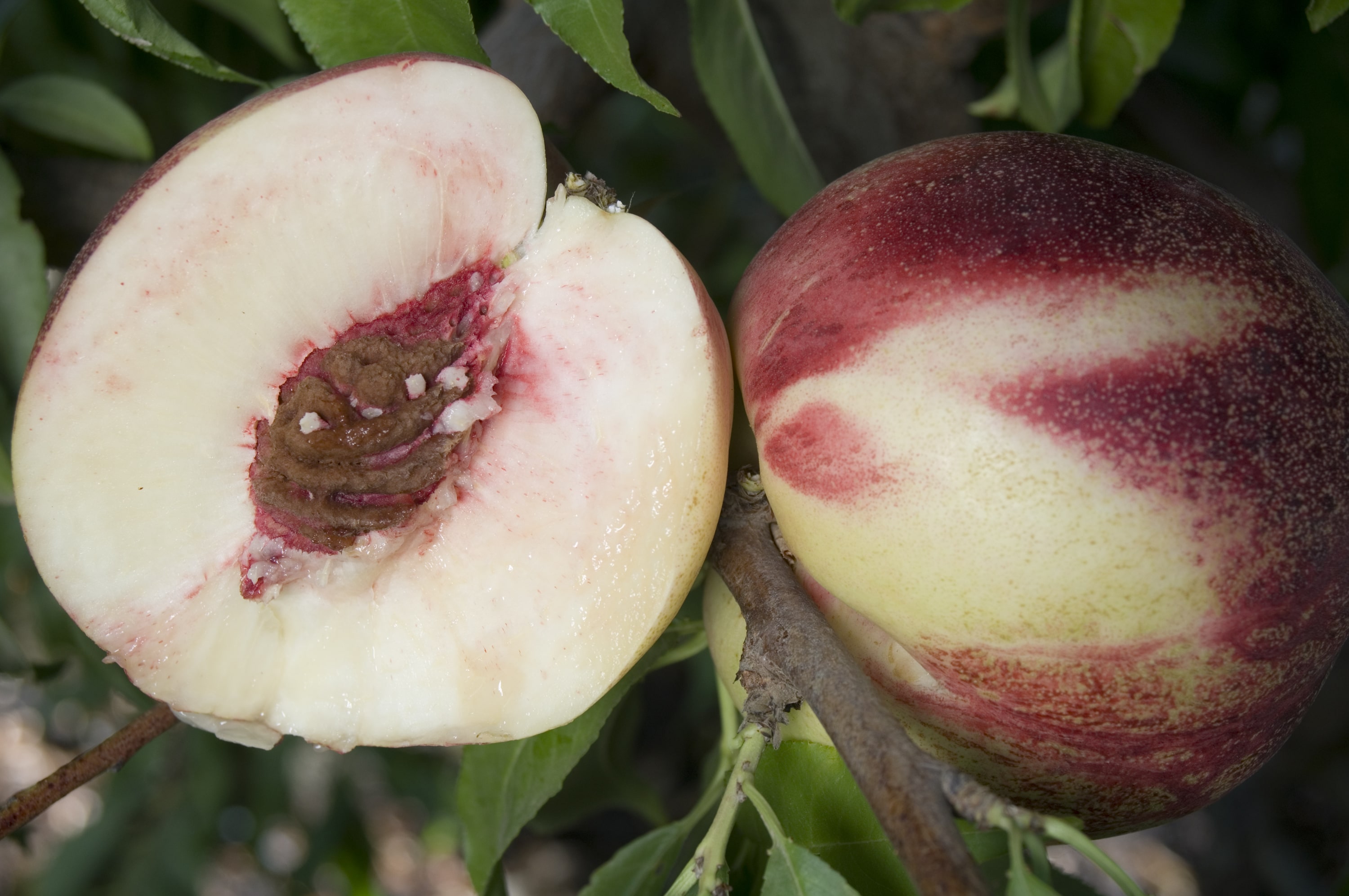 - Multiple white peaches and nectarines on one tree.