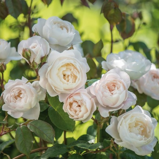 Desdemona is an English shrub rose introduced in 2015. The peachy-pink buds open to beautiful, white, chalice-shaped blooms, with a pinkish hue. The incurved petals create an arresting interplay of light and shadow. The strong Old Rose fragrance has hints of almond blossom, cucumber and lemon zest. It forms a most attractive neat, rounded, bushy shrub. Grow in full sun in all soil types. At maturity it can grow to 4 feet tall and 3 feet wide. Ideal for rose hedges, containers, mixed border or rose border.
