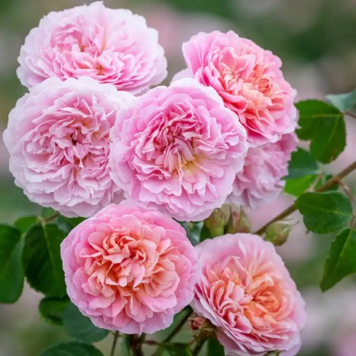 An exceedingly pretty rose of soft, glowing apricot-pink, each bloom packed with numerous delicately ruffled petals. Held on red-tinged stems, the blooms begin as shallow cups, opening to full rosettes, revealing petals of a richer hue, which gradually pale over time. They have a delicious strong fruity fragrance. A very healthy variety; it makes a strong, vigorous shrub with bushy, upright growth.